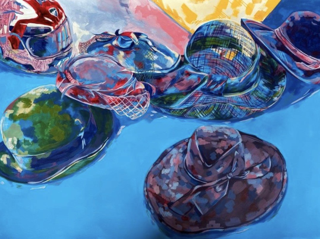 This still life depicts a collection of hats and helmets arranged across a vivid, colourful background. Painted in acrylic, the piece relies on layered hues and intentionally unblended brushstrokes to create energy and movement. The visible textures and bold colour choices bring the objects to life while giving the composition a dynamic rhythm. Through this work, I began developing a clearer sense of my personal style—experimenting with expressive colour, confident mark-making, and a more playful approach to still-life painting.