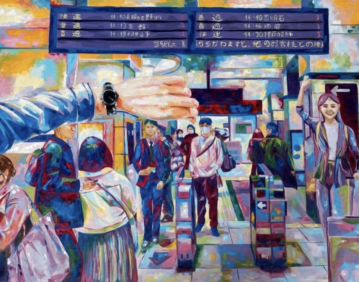 Set in a bustling Japanese train station, this painting captures a first-person moment of meeting someone dear—a friend or partner—amid the movement of daily commuters. The vibrant, saturated colours convey feelings of joy, anticipation, and the emotional spark of reunion. Using thick layers of oil paint applied with a spatula, the piece gains a tactile, textured surface that enhances its energy and depth. Time plays an important thematic role: the prominent watch and the station’s schedule board emphasize the value of each moment and the idea that meaningful time should be spent without regret.